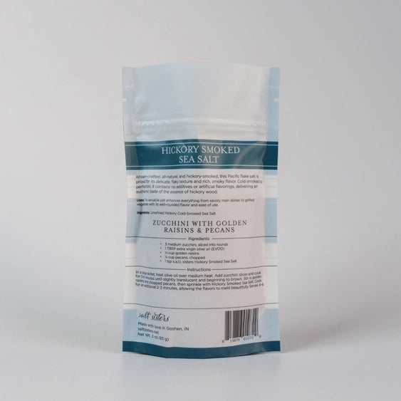 - HICKORY SMOKED-Artisan-crafted, all-natural, and hickory-smoked, this Pacific flake salt is prized for its delicate, flaky texture and rich, smoky flavor. Cold-smoked to perfection, it contains no additives or artificial flavorings, delivering an authentic taste of the essence of hickory wood. This versatile salt enhances everything from savory main dishes to grilled vegetables with its well-rounded flavor and ease of use.* Zucchini w/ Golden Raisins & Pecans recipe on back.Our USA made, farm to table products contain no MSG, no preservatives and are non-GMO, making them a great idea for host / hostess gifts or as a way to elevate special events such as game day, family gatherings and holidays.